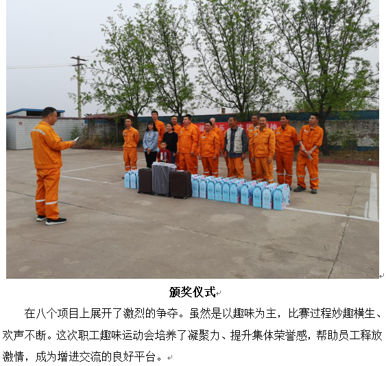 2019職工趣味運(yùn)動會 為進(jìn)一步增強(qiáng)職工們的身體素質(zhì),豐富文體生活,增強(qiáng)凝聚力,在“五四”青年節(jié)來臨之際兗州文水分公司、呂梁分公司、中材文水分公司精心籌備,周密策劃的職工趣味運(yùn)動會,在兗州文水分公司生活區(qū)如期舉行。本次運(yùn)動會的主題是“以促進(jìn)友誼為主,貴在人人參與,活躍公司氣氛”。以青年員工為主20多名干部職工參加了本次運(yùn)動會。通過自娛自樂這種形式,增強(qiáng)團(tuán)隊(duì)合作精神,培養(yǎng)職工熱愛運(yùn)動,促進(jìn)身體健康,增強(qiáng)公司凝聚力、戰(zhàn)斗力、號召力的目的。5月6日下午,三個分公司的職工趣味運(yùn)動會,在經(jīng)理王建立宣讀比賽規(guī)則后拉開了帷幕。此次活動由辦公室人員組織策劃,得到公司大力支持與全體員工的積極配合和參與。本次運(yùn)動會共設(shè)有八個比賽項(xiàng)目: