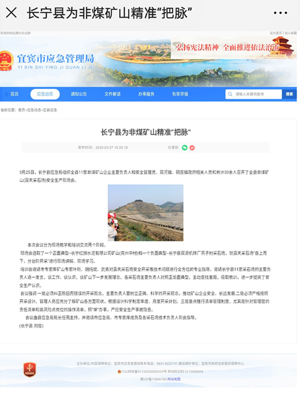 3月25日,宜賓市長寧縣應(yīng)急局組織全縣11家非煤礦山企業(yè)負責人和安全管理員、雙河鎮(zhèn)以及硐底鎮(zhèn)政府相關(guān)人員共計30余人召開了全縣非煤礦山(露天采石場)安全生產(chǎn)現(xiàn)場會。 長寧縣應(yīng)急局邀請兗州中材長寧分公司作為全縣非煤礦山的正面典型為參會企業(yè)分享開采經(jīng)驗。 上午9點參會人員到達長寧分公司―紅獅水泥礦山現(xiàn)場,分公司員工與業(yè)主接待了到場的市縣領(lǐng)導(dǎo)以及企業(yè)參會人員。同時嚴格按照防疫要求進行體溫測量,人員信息登記入場。   9:30分全部人員到齊,由長寧分公司職工帶領(lǐng)大家參觀礦山現(xiàn)場,為參觀人員介紹礦山整體情況,相關(guān)開采技術(shù),并解答參觀人員提出的問題。    10:30參觀結(jié)束,參觀人員對于此行都感到滿意,我們的礦山工作也得到了大家的認可,相關(guān)同仁們都紛紛表達此行收獲甚多。 現(xiàn)場參觀學(xué)習(xí)結(jié)束后,當天下午召開了室內(nèi)培訓(xùn)會,培訓(xùn)會邀請了市專家?guī)鞂<遥瑫r長寧分公司職工葉剛同志很榮幸在受邀之列。 針對于非煤礦山安全開采等技術(shù)問題,兗州中材長寧分公司作為正面企業(yè)給參會企業(yè)分享了好的經(jīng)驗,同時也從會議中汲取了其他好的經(jīng)驗方法。 3月27日,宜賓市應(yīng)急管理局報道了此次會議。此次會議中市縣領(lǐng)導(dǎo)高度評價了兗州中材長寧分公司的礦山開采工作,同時被市縣領(lǐng)導(dǎo)評為正面典型我司感到很榮幸。在此后的工作中我們要更努力,爭取更大的進步,樹立好我們的企業(yè)形象。 |