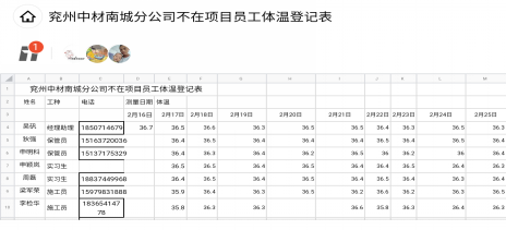 三、加強(qiáng)員工管理,落實(shí)檢查制度 分公司建立多種檢查制度,通過現(xiàn)場(chǎng)人員現(xiàn)場(chǎng)檢查、在項(xiàng)目隔離人員與未返工員工自查等多種形式進(jìn)行人員健康狀況監(jiān)測(cè),并如實(shí)記錄,如有異常者及時(shí)送醫(yī)就診,做到“早發(fā)現(xiàn),早隔離,早上報(bào),早治療”,切斷傳播途徑,杜絕疫情蔓延。 1、現(xiàn)場(chǎng)人員檢查