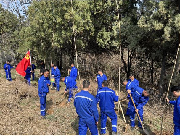 臨近3.12植樹節,為響應中材礦山“黨旗紅,礦山綠”的主題植樹活動,本次團建活動特意加入了植樹環節。大家有的鏟土挖坑、有的培土植樹,有的澆水灌溉,個個爭先恐后,干得熱火朝天。