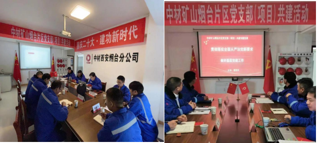 為全面貫徹落實新時代黨的建設總要求,根據中共中材礦山建設有限公司委員會下發《關于開展中材礦山建設有限公司黨支部(項目)共建的通知》,2022年12月9日,兗州中材棲霞分公司、萊州分公司與中材西安煙臺分公司聯合開展黨支部(項目)共建活動。